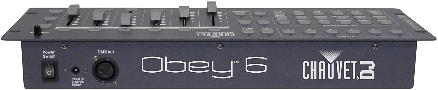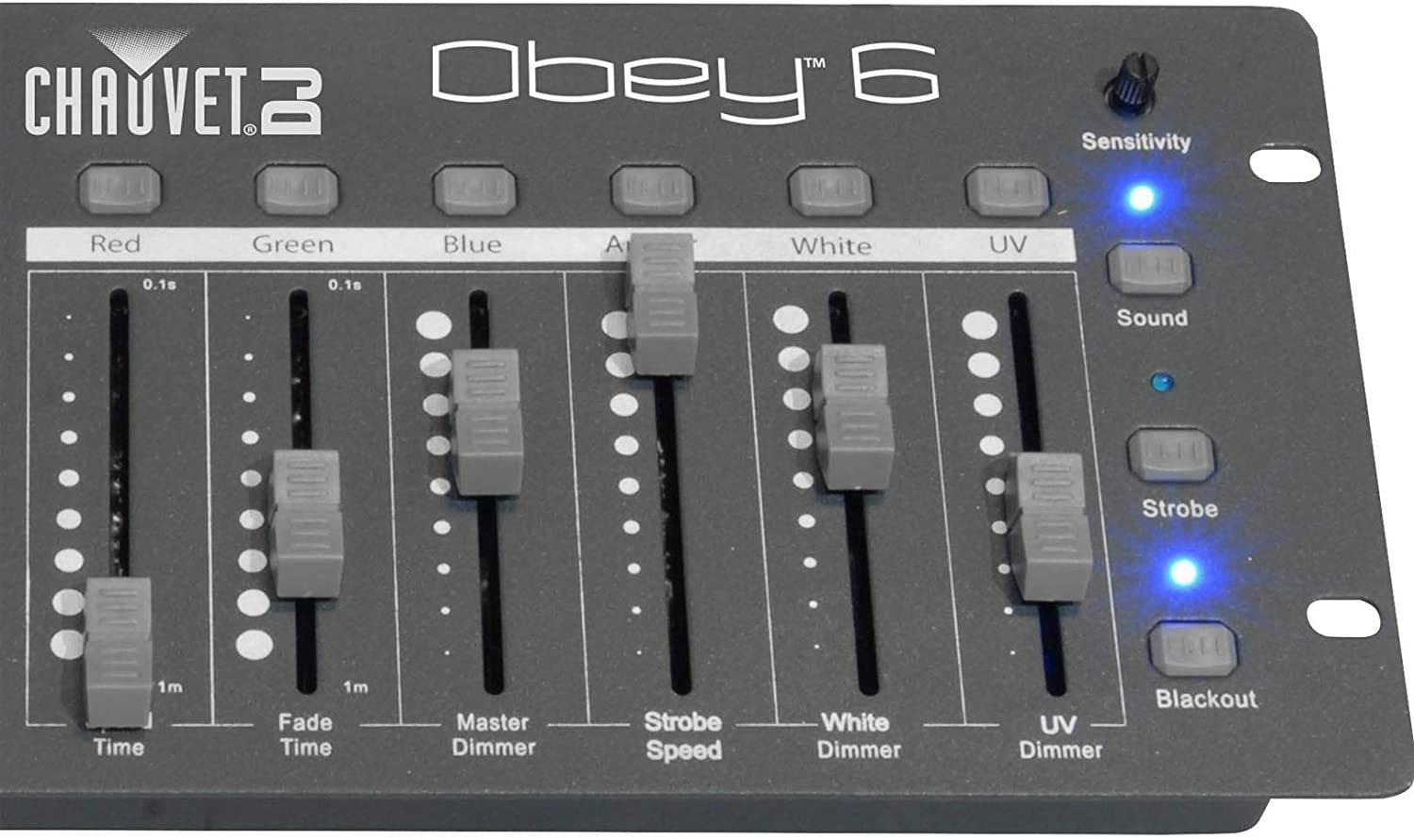 Obey' 6 is a universal, compact controller capable of controlling up to 6 channels per fixture. It allows you to control effects by simultaneously operating each fixture in different playback modes, with variable fade times. Increase flexibility with playback options that include manual RGBAW+UV, automated and sound-activated mode. Increase control with adjustable audio sensitivity, strobe, and blackout effects.