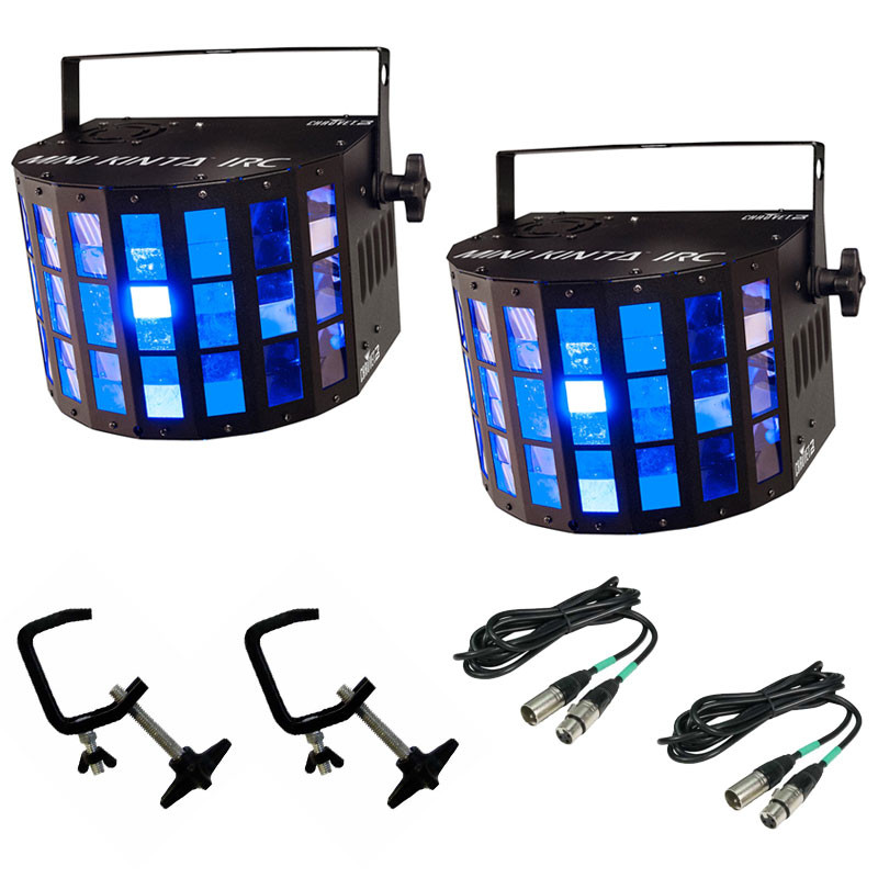 Grab a 2-pack of this bestselling Chauvet DJ light! Includes (2) C-clamps and (2) 10 ft. 3-pin DMX cables. Fitted with 3W LEDs to punch through nearly any ambient lighting, the Mini Kinta'IRC fills the room with sharp beams and features more output and broader coverage than derby effects twice its size. Simple wireless, non-DMX control from the optional IRC-6 creates the perfect looks without having to be a programing genius.