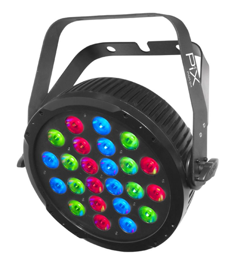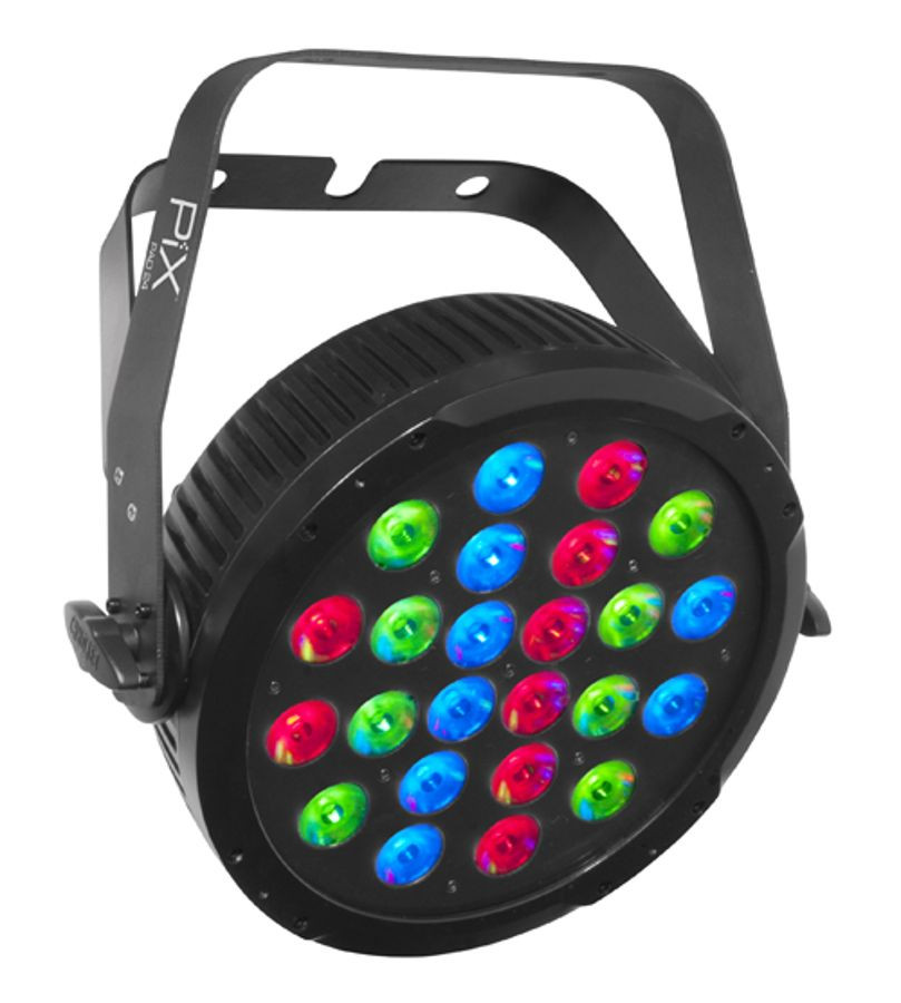 Great for use as a standard PAR with the additional eye candy of pixel mapping effects, PiXPar' 24 is a must-have fixture for mobile DJs or club installers looking for high-impact visuals on a budget. This pixel mapping PAR can-style wash light is powered by 24 tri-colored LEDs for an intense output of bold effects. Individually controllable tri-colored LEDs project custom effects and create a saturated, seamless wash. Built-in programs and multiple DMX personalities increase design flexibility while on-board 3- and 5-pin DMX connectors increase control options.