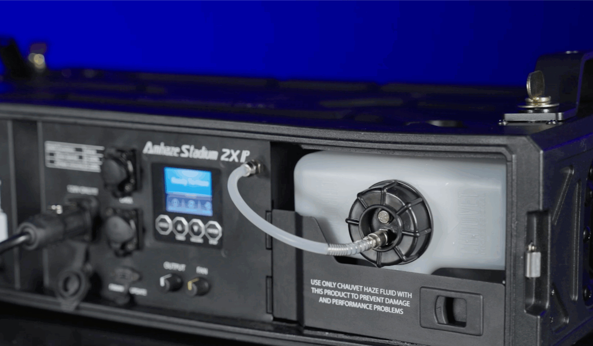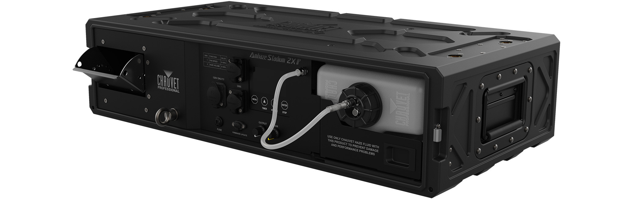 Amhaze Stadium 2X IP is built for the rigors of touring with a design that delivers reliability, longevity and easy serviceability. An innovative heater system produces continuous output and minimizes maintenance, while a peristaltic pump eliminates contact with fluid, removing its risk of corrosion. A USB-C port for easy software upgrades in the field completes this fully featured professional unit.