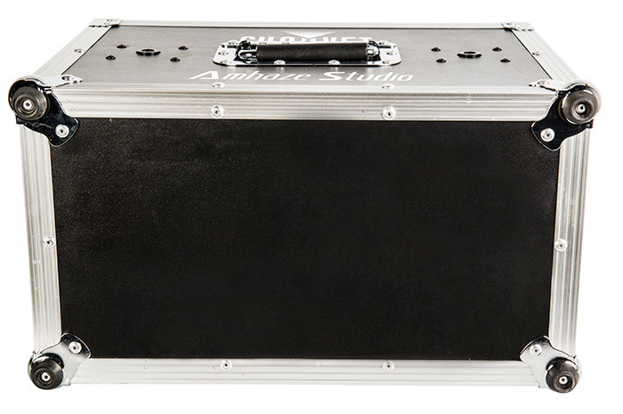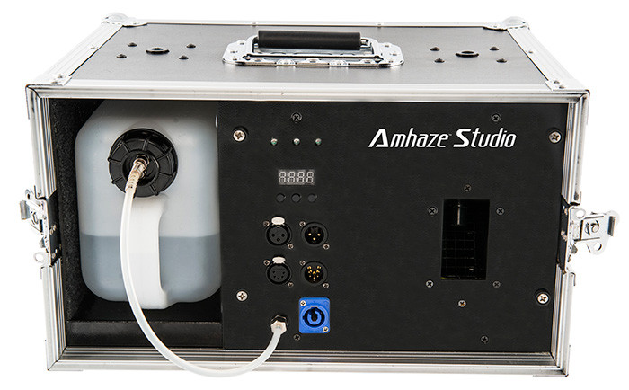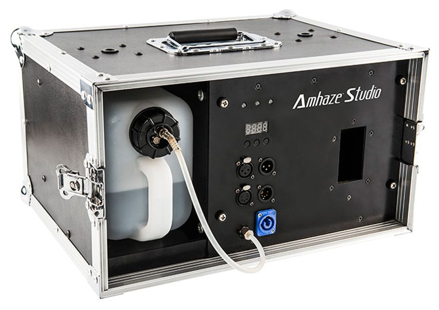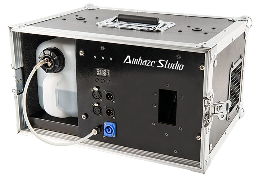 Amhaze' Studio is the answer to haze sound-sensitive environments. It combines a large 3.2L fluid tank, rapid 4-minute heat-to-ready time, and a voluminous maximum output of 1,700 cubic feet of haze per second. With its tough construction, integrated flight case design, and industry standard power and data connections, Amhaze' Studio is ready for productions of any size and scale.