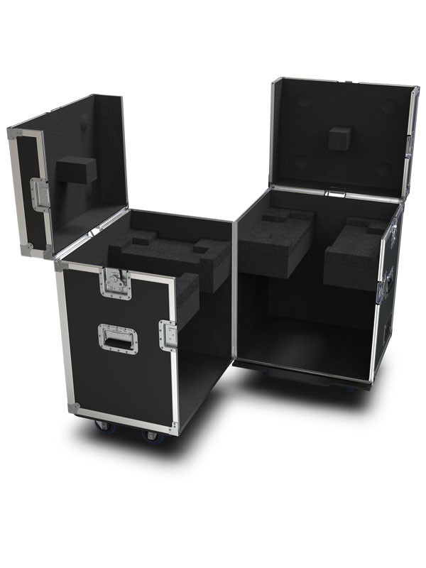 Two-unit flight case custom designed to hold Maverick MK1 Spot, Maverick MK1 Hybrid, Maverick MK2 Spot, and Maverick MK2 Profile
