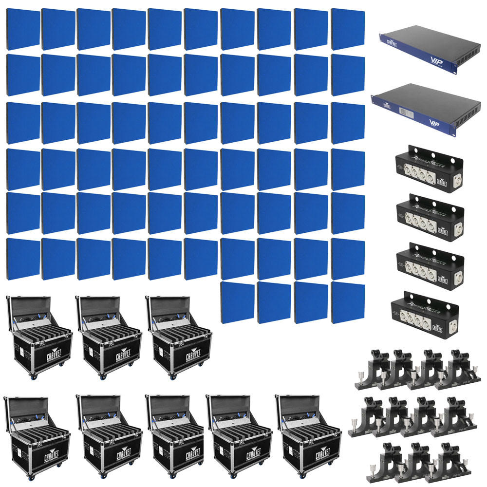 Measuring approximately 16 feet wide by 10 feet high, this pre-configured video wall package utilizes (60) high-res PVP S5 panels (including 4 backups) and includes a VIP Driver, a VIP Signal Distributor, as well as all necessary powerCON linking cables, etherCON linking cables, rigging kits to properly hang the wall, as well as road cases to house/protect the video wall panels.