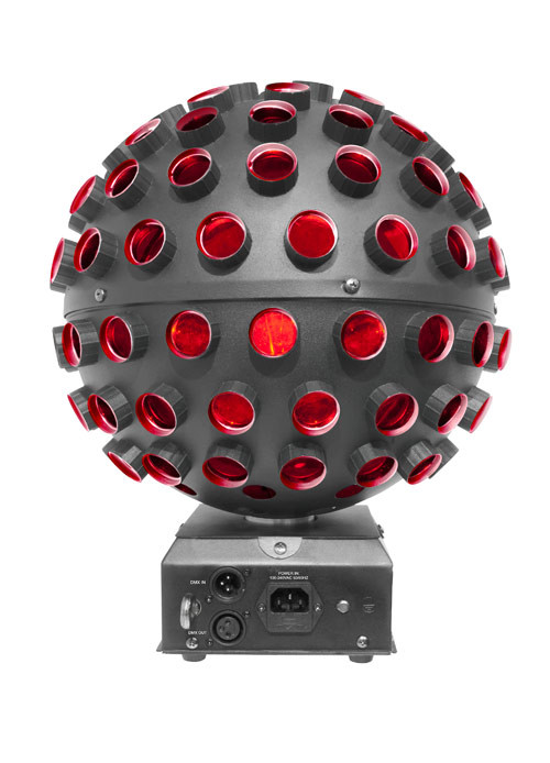 RotoSphere' LED is a mirror ball simulator that is easy to use and DMX controllable. Powered by five tri-color LEDs, this fixture blankets the entire room in multi-colored beams with smooth and continuous 360 rotation. Evenly spaced lenses optimize output and reduce dead spots while adjustable rotation speed lets you match the mood of the music.