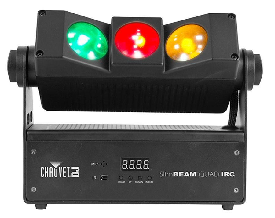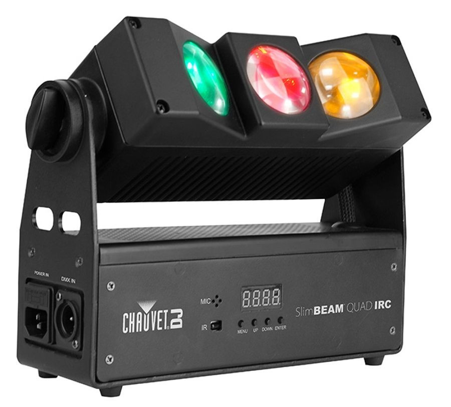 SlimBEAM' Quad IRC is a versatile fixture that is not only ideal for accenting walls and other surfaces, but also can be used to create unique beam effects. With no moving parts, it's ideal for venues where silent operation is essential. Multiple units can be linked in master/slave mode. Control options include automated, and DMX mode. Optional IRC-6 remote can be used for wireless control.