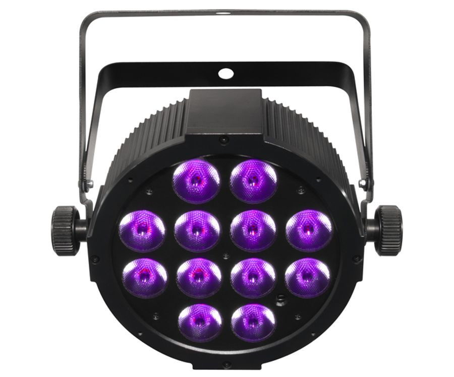 SlimPAR' Quad 12 IRC is a low profile, high-power LED PAR designed for any application where wash lights are needed. Twelve quad-color (RGBA) LEDs make this the perfect front light by eliminating multi-color shadows and providing a smooth, even output. The addition of the infrared remote control (IRC) allows simple operation and eliminates the hassle of programming. With a 100% convection cooling system, there is no fan noise to distract the audience.