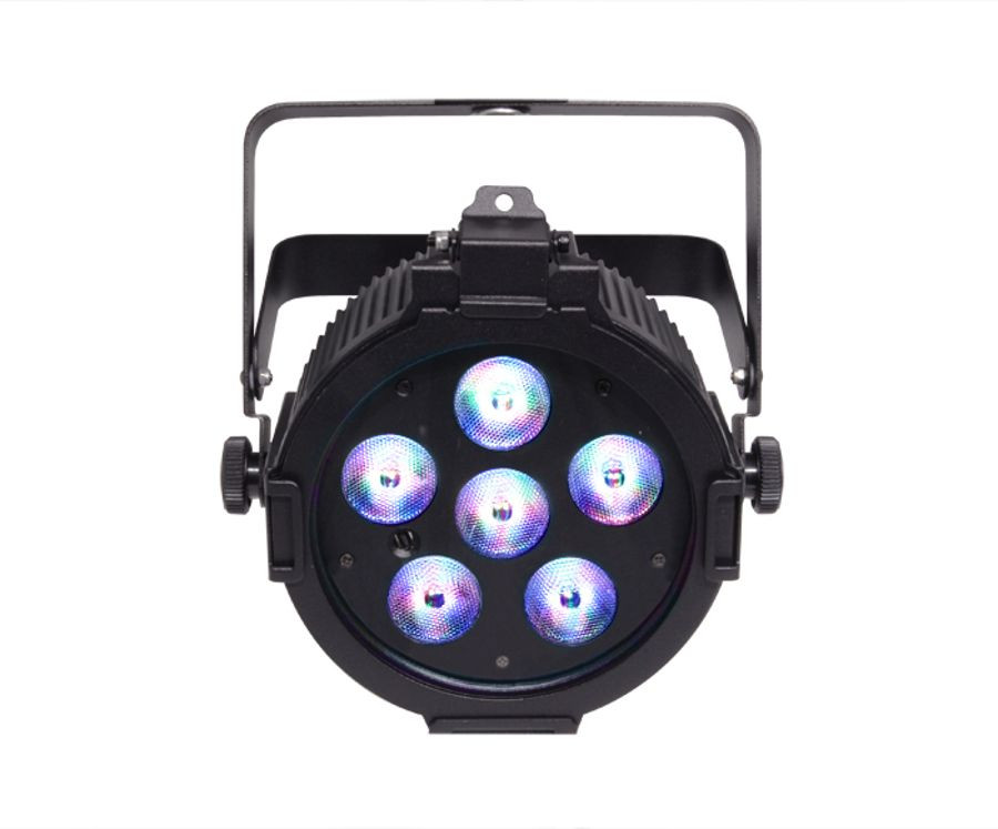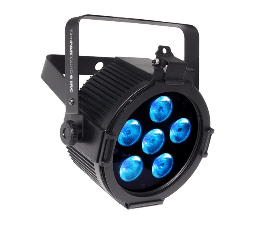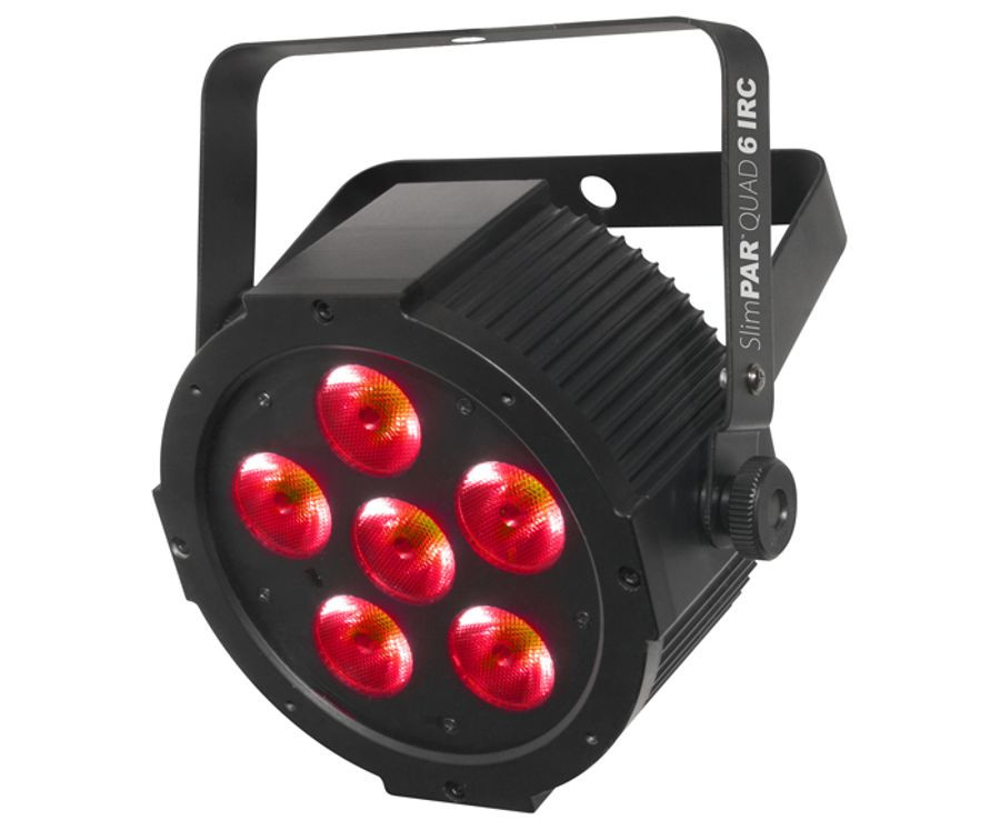 SlimPAR' Quad 6 IRC is a low profile, high-power LED PAR designed for any application where wash lights are needed. Six quad-color (RGBA) LEDs make this the perfect front light by eliminating multi-color shadows and providing a smooth, even output. The addition of the infrared remote control (IRC) allows simple operation and eliminates the hassle of programming. With a 100% convection cooling system, there is no fan noise to distract the audience.