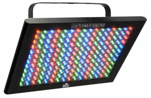 The LED Techno Strobe' RGB is a 6-channel color mixing DMX strobe light. Along with blackout, dimmer, static, and strobe functions, full RGB color mixing, adjustable flash rate, dimmer and static are available via dipswitch settings.