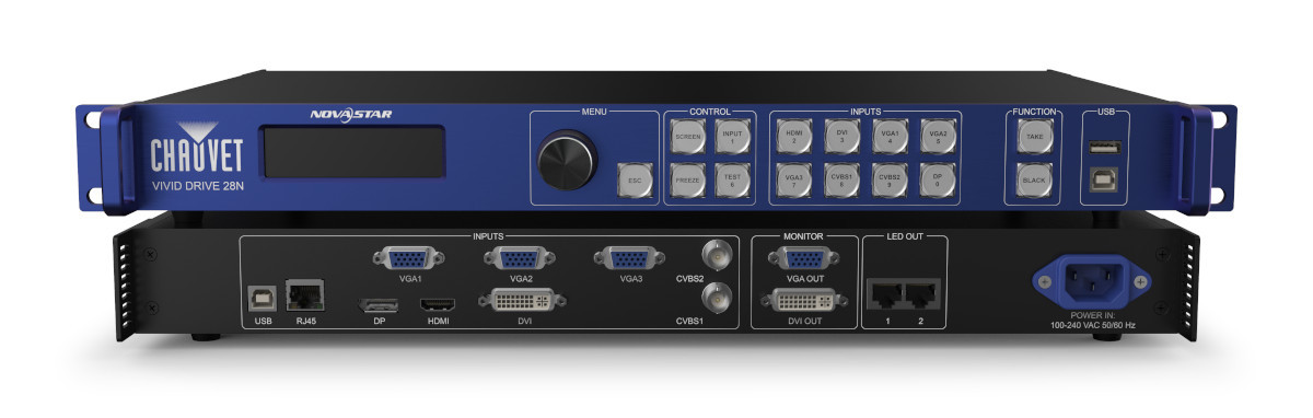 Vivid Drive 28N is an easy-to-use video driver for CHAUVET DJ Vivid 4 video panels or any Novastar video panel. No computer needed! Vivid Drive 28N features powerful standalone mapping and a built-in video scaler for quick resizing of video content. Numerous input/output options are on board as well as backlit buttons for easy viewing in dark environments. The front knob can be set to control the master dimmer and you can seamlessly transition between different inputs with multiple transition effects. Compact 1U packing eases transportation and integration into your existing setup.