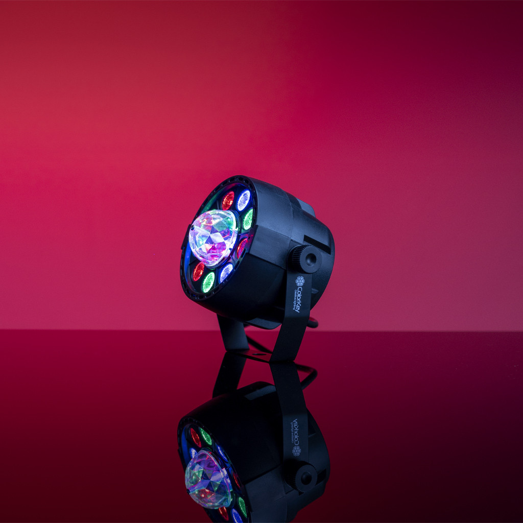 Get your party started with the ColorKey PartyLight FX! This compact quad color LED wash light features a motorized RGB party bulb for a one-of-a-kind lighting experience. Paint your walls with color while a rotating RGB bulb sends swirling beams of light across the room. Setup is a breeze when using the included IR remote. It offers quick access numerous built-in programs such as Auto, Chase, Fade and Sound Active mode. Quickly select a static color or one of the numerous patterns to create a fun energetic atmosphere at your next event.