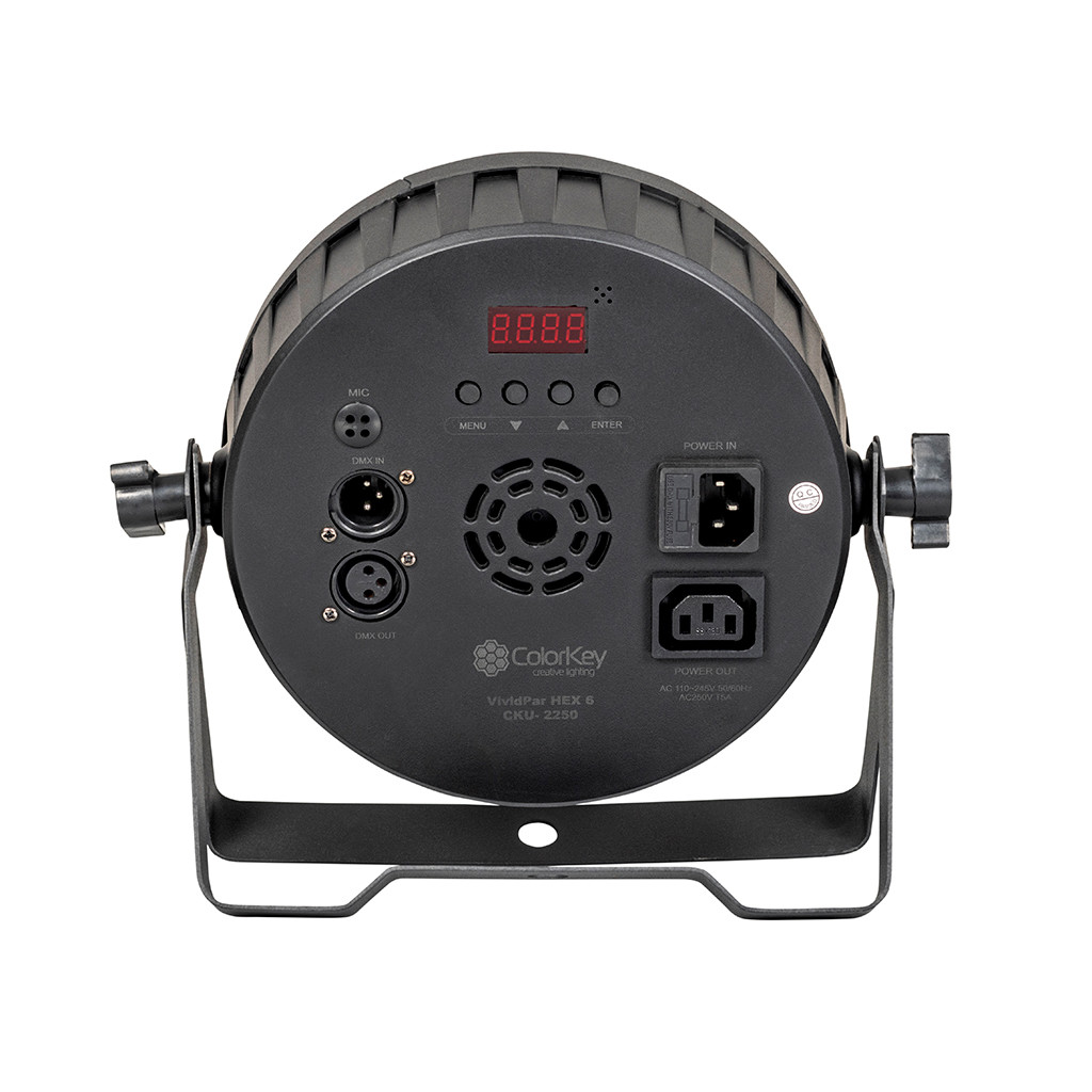 Take advantage of the built-in Master/Slave Auto-programs and let VividPar HEX 6 run unique lighting show when more than one VividPar HEX 6 is connected in series. Get the effects of a programed lighting controller all with our built-in Auto-program settings. Power and DMX 56 in/out make VividPar HEX 6 a great choice for Mobile DJs, Bars, Clubs and Corporate Events.