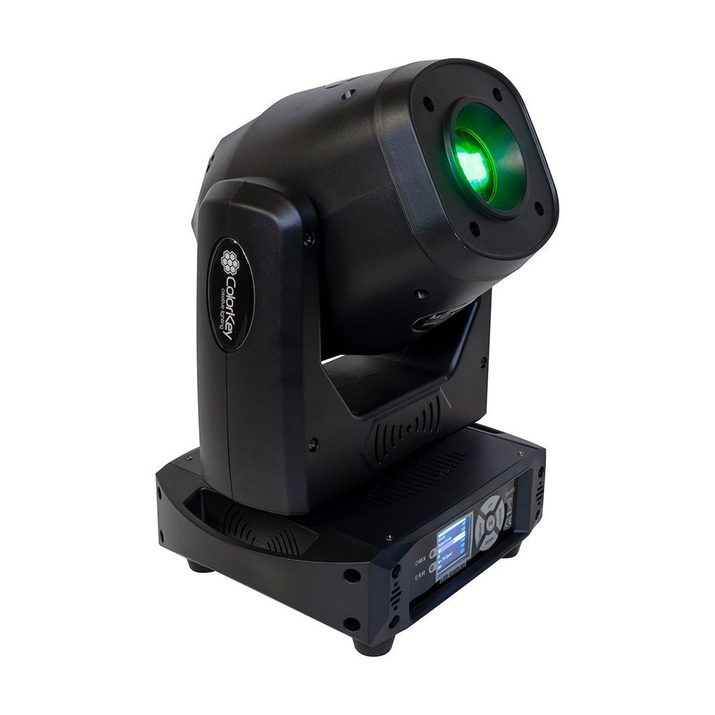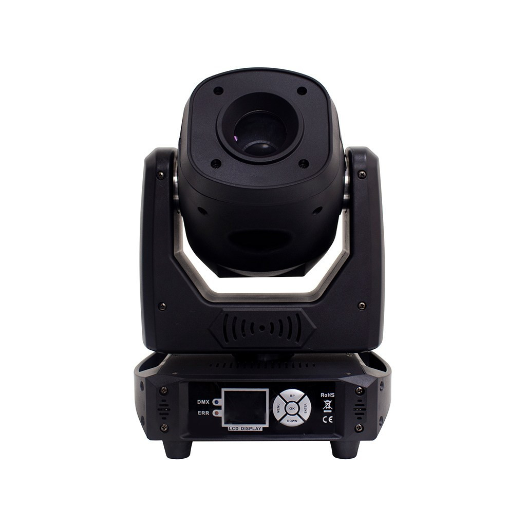 80W Moving-head LED Spotlight with Two Gobo Wheels (One Metal, One Rotating Glass), Motorized Focus, Rotating 3-Facet Prism, 8 Colors, Automated/Sound-activated Programs, and DMX Control. Easily operate the light with the Full-Color LCD screen. The unit also features PowerCon in/out for power linking. This versatile light is a powerful and compact fixture perfect for Mobile Djs, Small Bars, Clubs or Corporate Events.