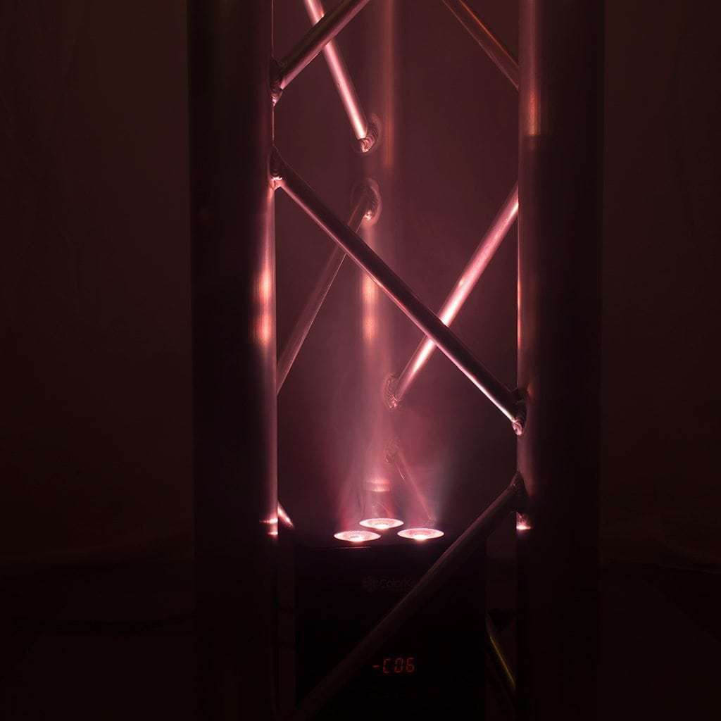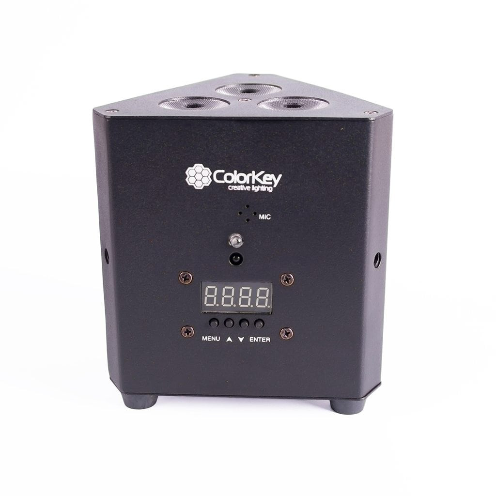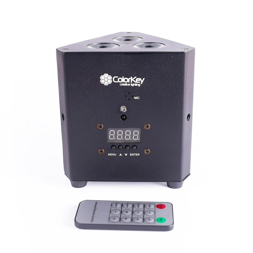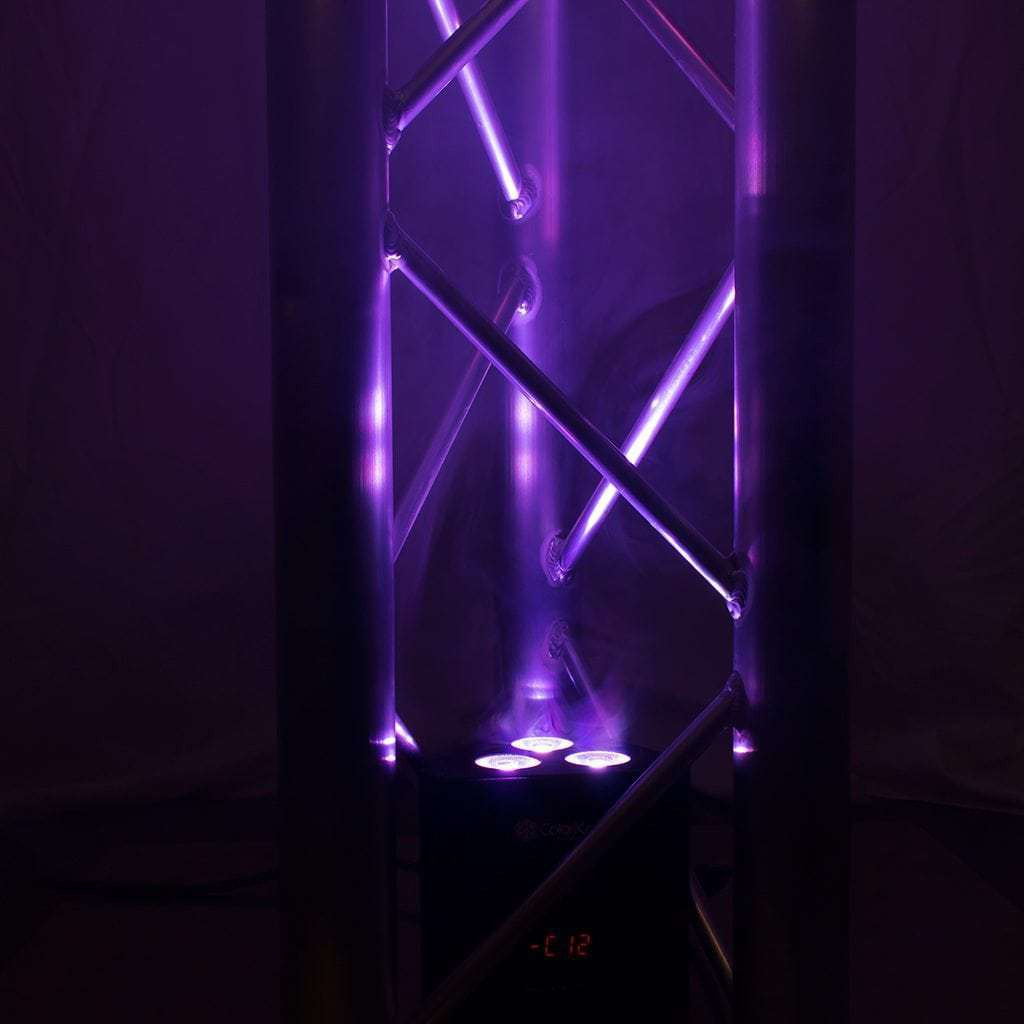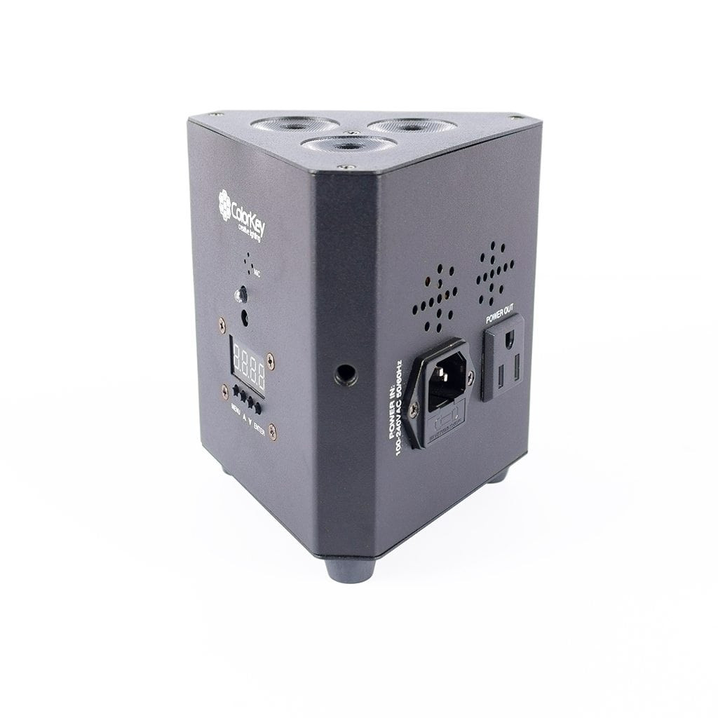 The ColorKey TrussPar QUAD 3 is a lightweight and compact par fixture designed to fit inside most triangular truss. It is ideal for uplighting truss legs and totems with or without scrims, and also has threaded points for elevated mounting. The ColorKey TrussPar QUAD 3 features 3x10w RGBW LED's and includes an IRC remote to control colors and programs.