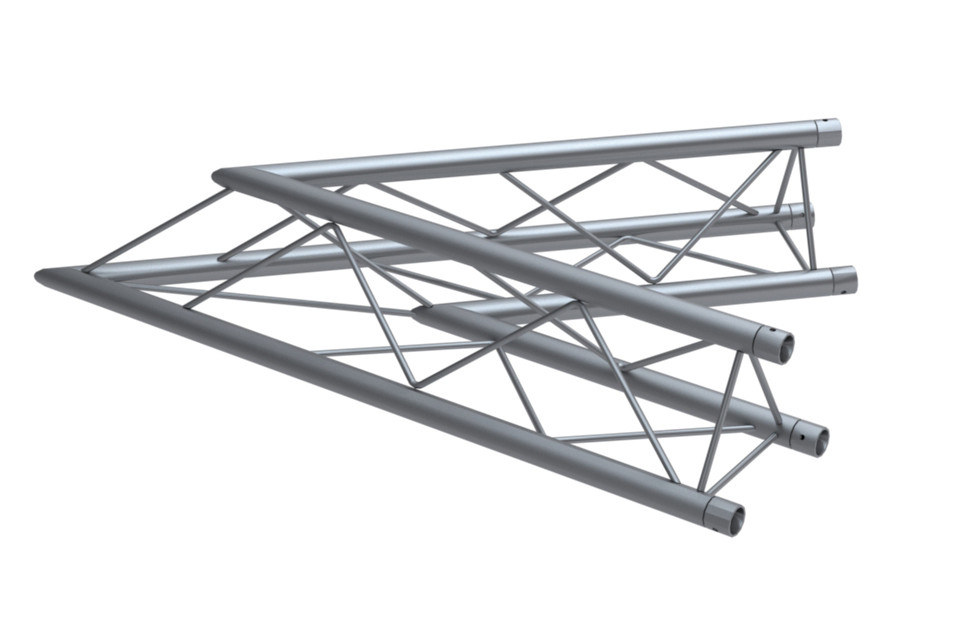 Cosmic Truss F23 is a triangular high strength truss system that combines lightweight and high capacity. The triangular construction provides optimum strength and loading capacity for its size, with a standard tube diameter of 35mm (1.37 inch). Section pieces connect together using a conical coupler, which is then secured with a locking pin, and a further safety clip for added security.
