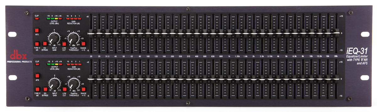 With an EQ heritage that has produced countless industry-standard patents and dates back more than 30 years, the dbx iEQ-31 easily lives up to the dbx legacy of uncompromised sonic integrity. In addition to unsurpassed equalization specs, the iEQ-31 also offers the built-in necessities which include AFS' feedback Suppression, Type V' noise reduction and PeakStopPlus limiting.