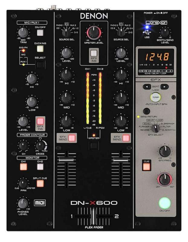 The DN-X600's firmware is upgradeable over USB. The unit has two quarter-inch "phono" inputs and two AUX inputs, mic input, effects send/return, stereo output, USB send/return, booth out and master out. The DN-X600 can withstand the rigors of night-after-night club use, as it features solid steel chassis construction, plus it has ideal grounding circuitry, protecting it from external noise. It measures 9.8" x 4.4" x 13" and weighs approximately 8.8 lbs. Power consumption is 24W, and the unit also features a green, energy-saving ECO standby mode.