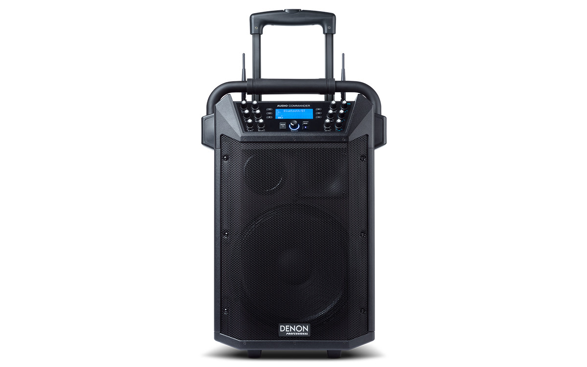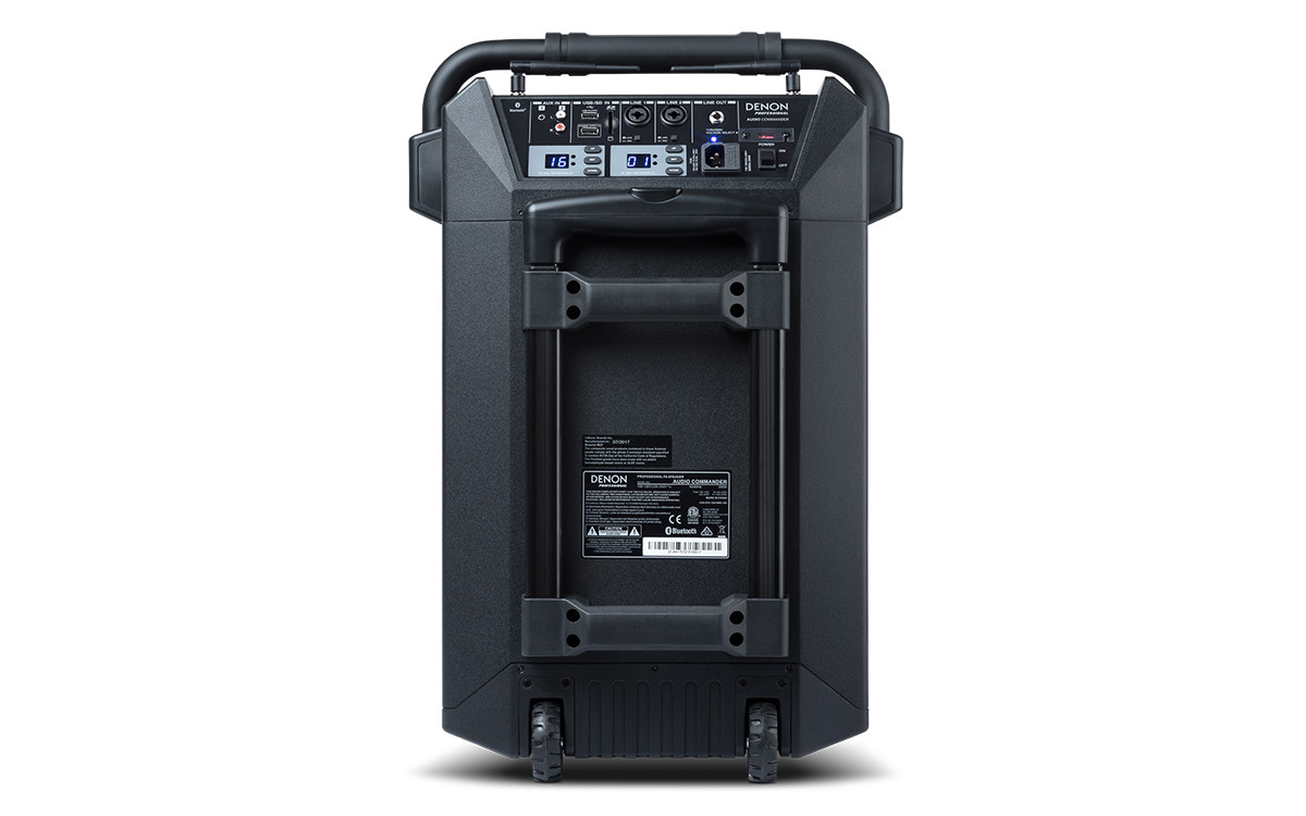 The Audio Commander is an all-in-one compact PA system designed to satisfy the needs of customers such as professional DJs, aerobics instructors, presenters or anyone needing a self-contained, self-powered unit without cables. The Audio Commander can operate on its internal rechargeable battery or AC power. Two UHF wireless microphones are included, along with the capability to play audio from Bluetooth devices, USB, and SD media. There are also two XLR/TRS combo jacks to facilitate MIC/LINE inputs. All of these features are packaged in a smartly-designed unit with luggage handle and wheels for easy transport and quick set-up. A water-resistant cover is included for storage, transport and protection from the elements.