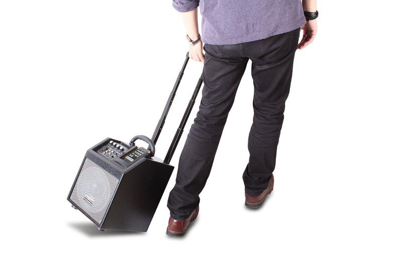 THANKS to the rechargeable battery which last for more than 12 hours.Wheels and Telescopic handle let you move quickly for all your sound trip.