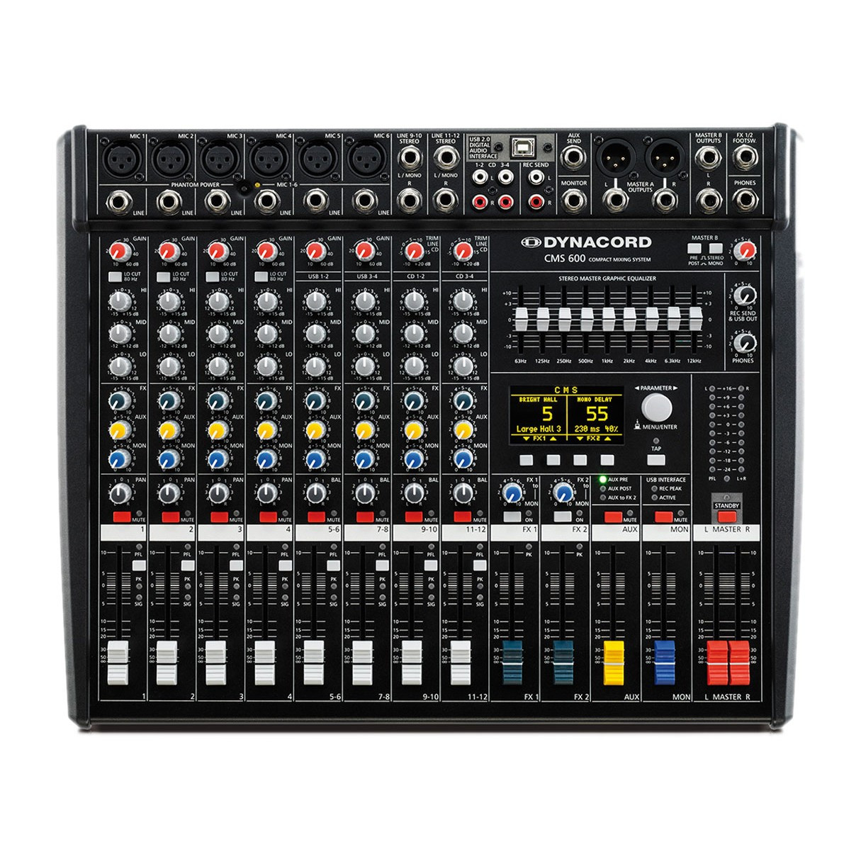 The DIGITAL AUDIO InterfaceThe DIGITAL AUDIO INTERFACE features two stereo channels, present as USB 1-2 and USB 3-4 in Super Channels 5-6 and 7-8 respectively. This professional interface is implemented with 24-bit resolution and sampling rates up to 96 kHz, satisfying studio requirements. The USB sends are supplied with the Master L and R, AUX and MON signals. The DIGITAL AUDIO INTERFACE can be used for input and output simultaneously. Via the USB 2.0 port of your PC / Mac, four channels can be transmitted simultaneously in each direction. When a USB 1.1 interface is used, two channels can be transmitted simultaneously in each direction. The CMS is designed for the level of standard PCs / Macs; the gain level can easily be adjusted from the connected computer. Included in the delivery is an instruction sheet and a licenses code for the Cubase LE software.