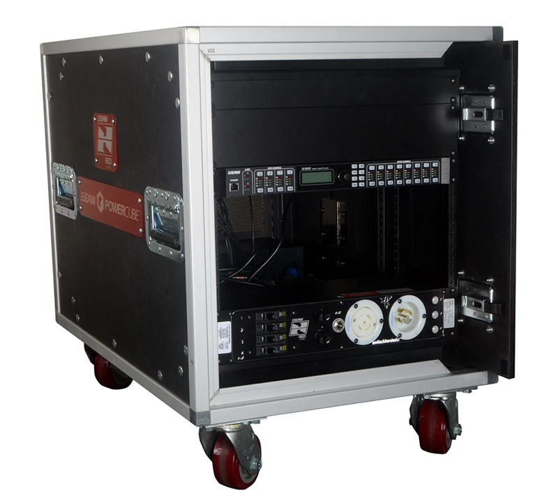 Powercubes feature a 10U rack with mounting rails front and back in a shock-absorbing cage to house the power distribution, amplifiers and input and output panels. Electrical power distribution panels include standard, three-phase input connectors and circuit breaker protected outputs configured to support each amplifier compliment.