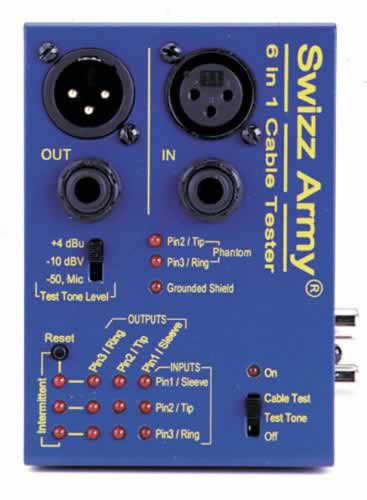 Not all cable testers are the same! The SWIZZ ARMY checks XLR, 1/4", RCA, 1/8", TT & MIDI cables for continuity and/or intermittant connections. Also detects opens and shorts for each pin. Other features include test tone generator (+4, -10, Mic), phantom power detector, grounded XLR shield detector and cable wiring display.