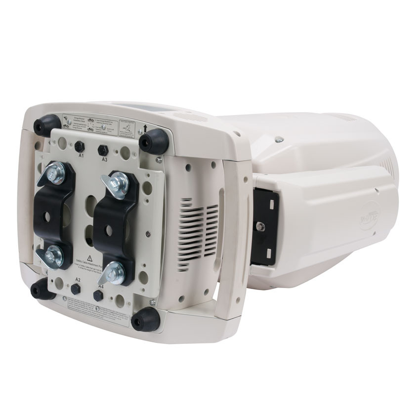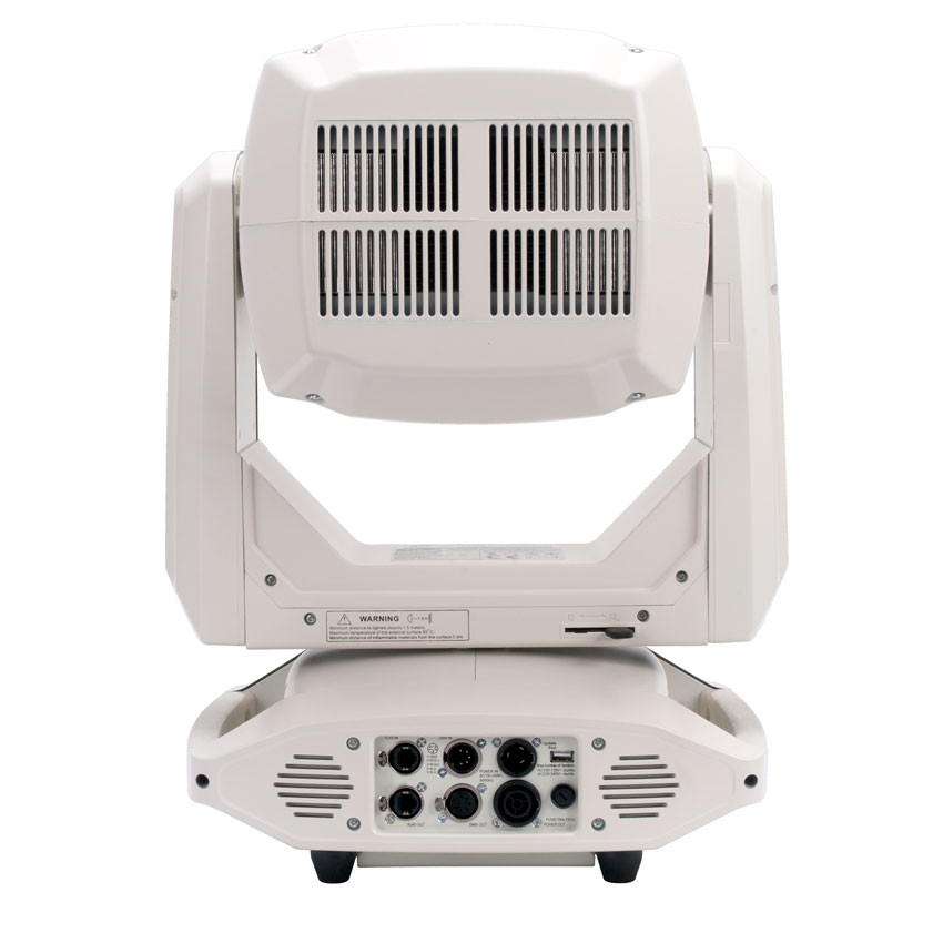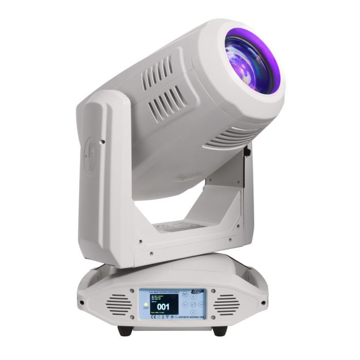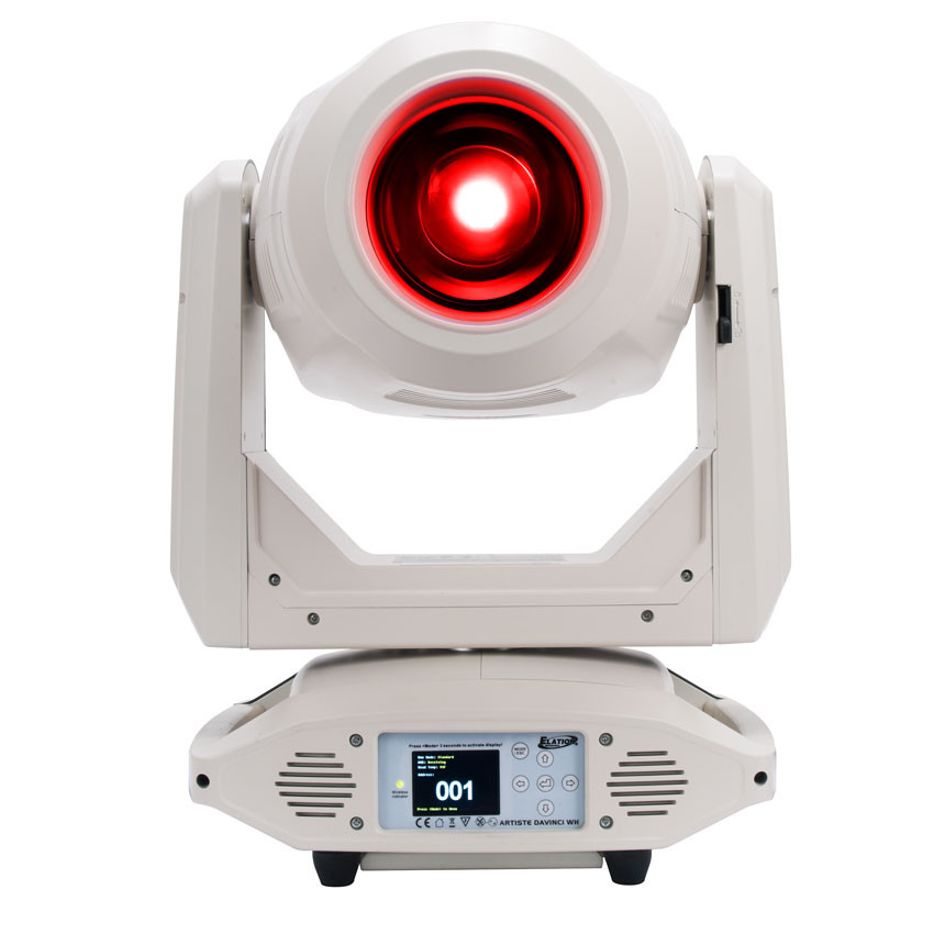 The Artiste DaVinci WH is an all white color exterior housing version of the Artiste DaVinci featuring a new 270W LED Cool White LED engine with advanced optics delivering over 12,000 total lumens, ultra wide 6 to 48 zoom, full CMY color mixing and linear CTO color correction, 7 dichroic colors including CTB and Violet, 6 rotating glass and 9 static-stamped metal interchangeable gobos, 3-facet and linear rotating prisms, frost filter, full 360 bi-directional animation wheel, motorized iris, focus, and auto-focus, variable dimming curve modes, high speed electronic shutter and strobe, hibernation mode, DMX, RDM (Remote Device Management), Art-NET, and sACN protocol support, Elation's E-FLY' internal wireless DMX transceiver, 5pin XLR, RJ45 etherCON, powerCON TRUE1 in/out connections, full color 180 reversible menu display with 6 button touch control panel, battery backup for display power, adjustable LED refresh rate and gamma brightness for flicker free operation for TV and FILM, and a multi-voltage universal auto switching power supply (100-240v).