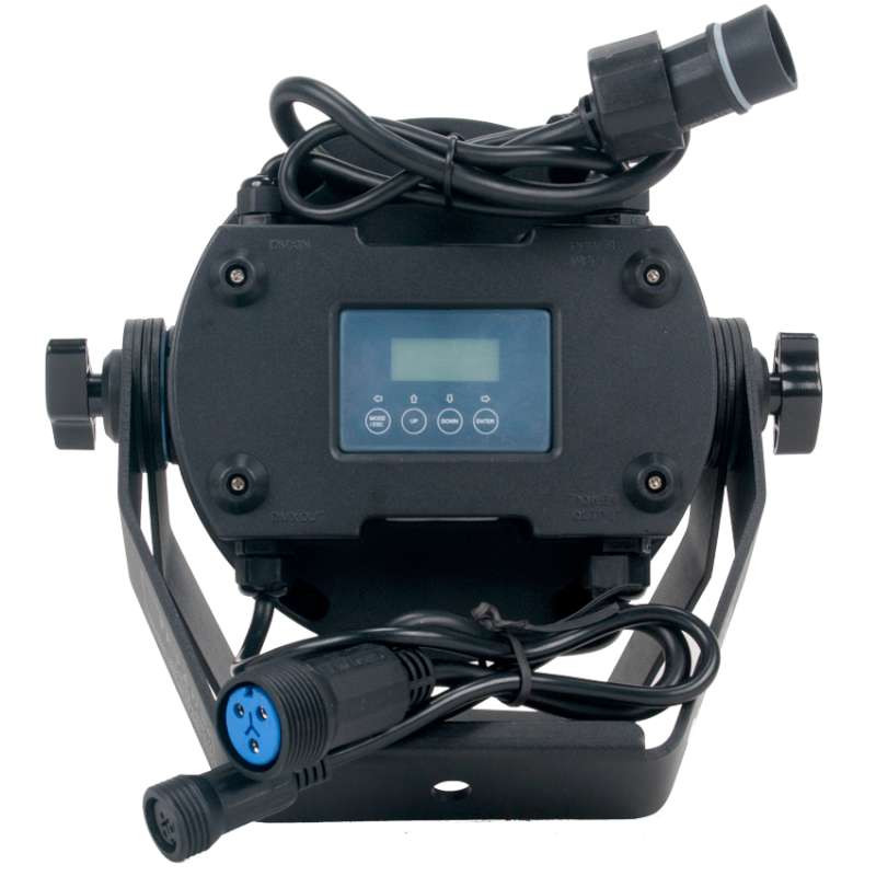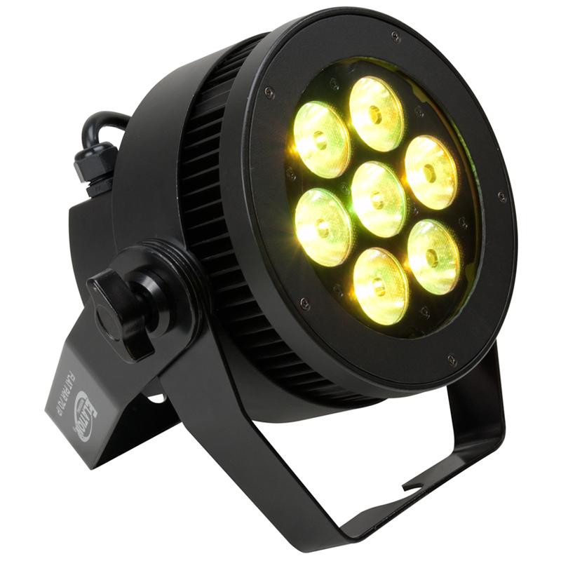 The new IP65 rated Level Q7 IP' features (7) 15W QUAD color RGBW LEDs, 7 beam and 13 field angles, color correction (2,700K - 7,200K), electronic strobe (1-18 fps) and dimming (0-100%), flicker free operation for TV and FILM, rugged die-cast aluminum exterior, rubber padded base with dual yoke / floor stand, multiple unit power linking, 127W max power consumption, and a multi-voltage universal auto switching power supply (120-240v)