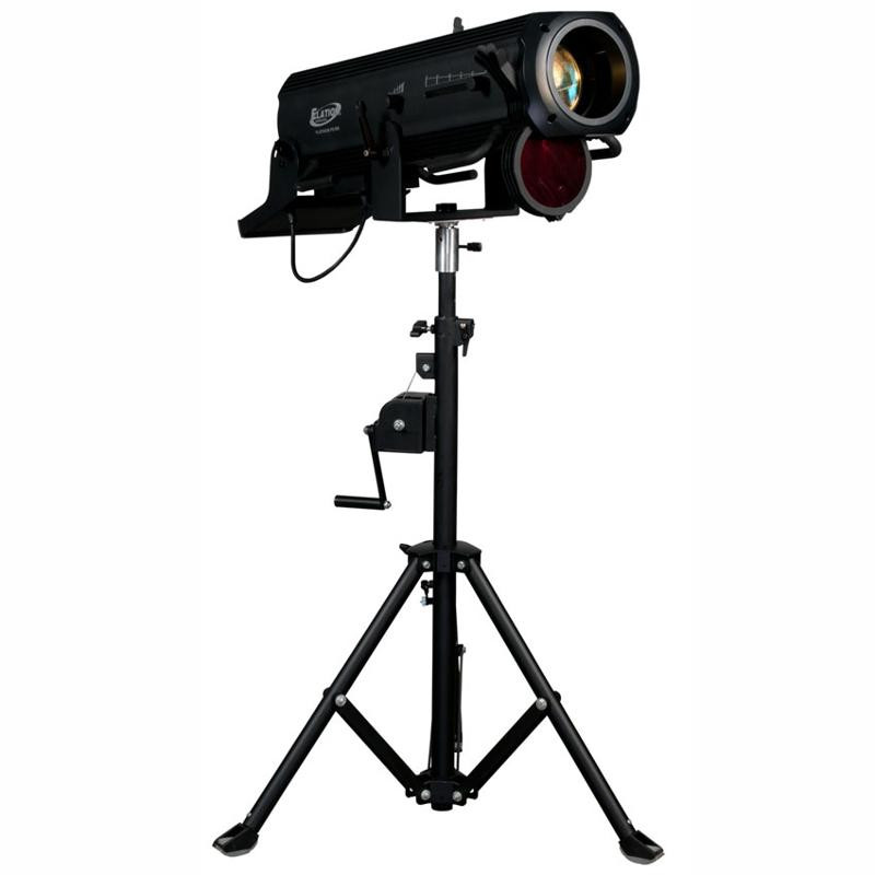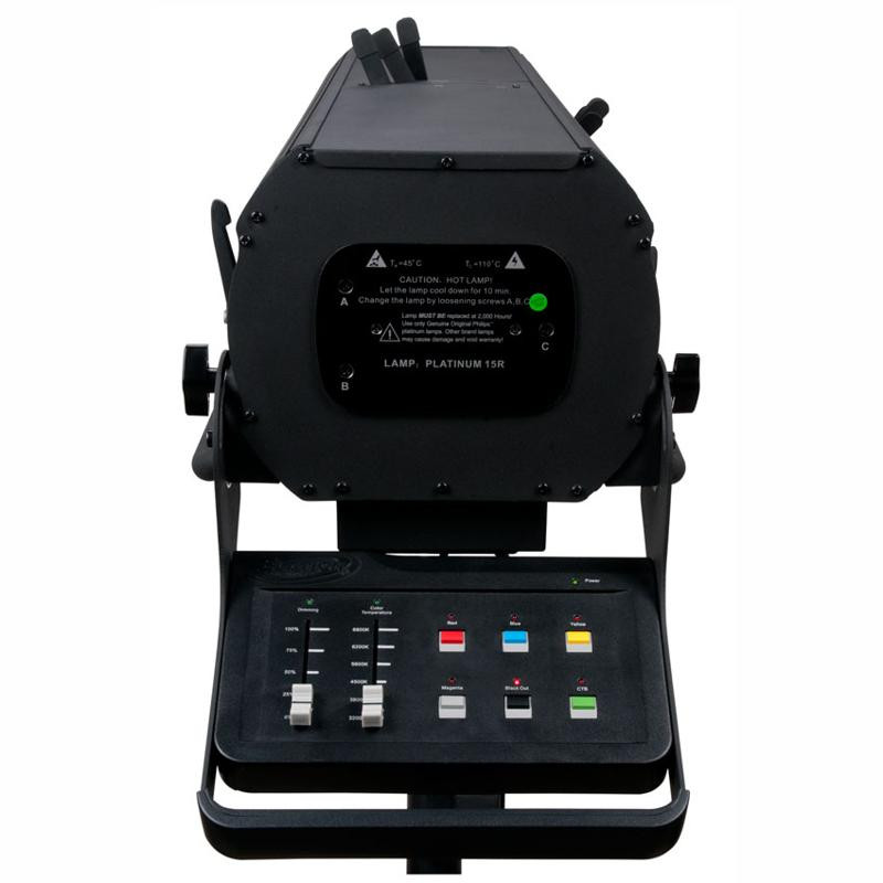 The new PRO FS 15R is a high output medium throw followspot featuring the Phillips' MSD Platinum 15R lamp, 2,000 hour average lamp life, 5 to 10 manual zoom, (6) dichroic colors including CTB and white, (4) manual gel frame holders, 0-100% smooth dimming, manual iris, frost, and framing effects, variable color temperature settings (3,200K - 6,800K), powerCON in, (6) button (2) fader control panel, 400W max power consumption, a multi-voltage universal auto switching power supply (100-240v), and included tripod stand and road case.