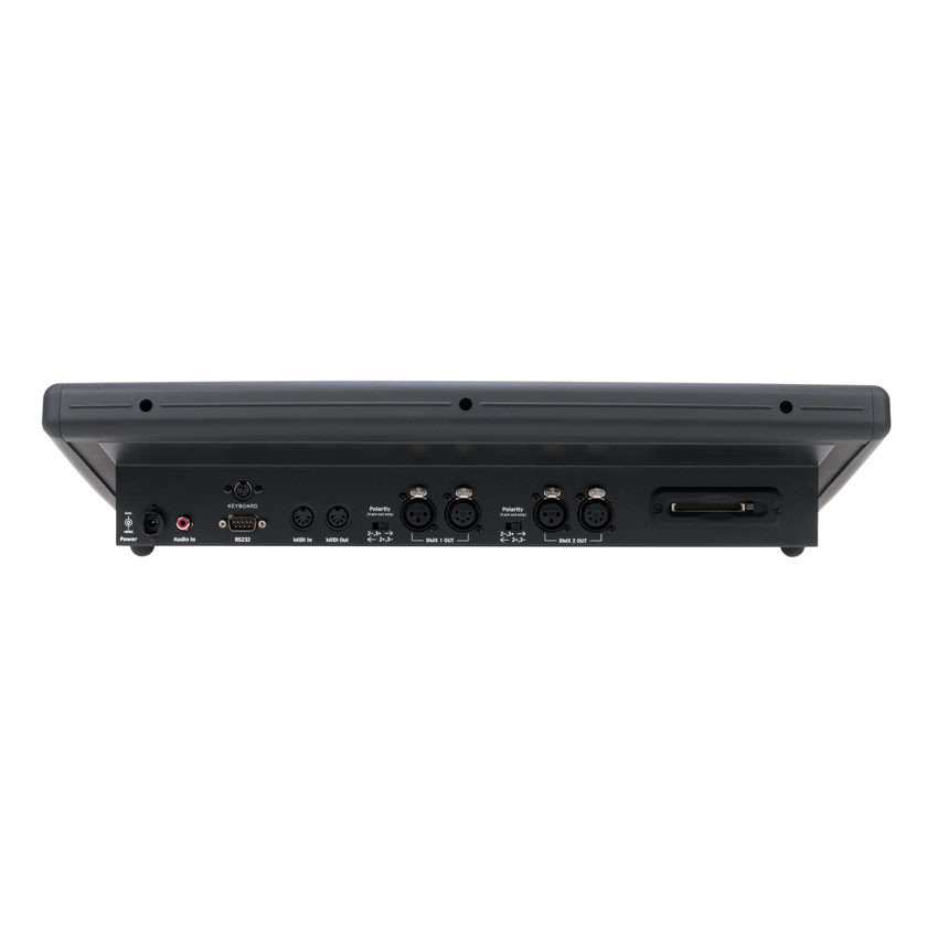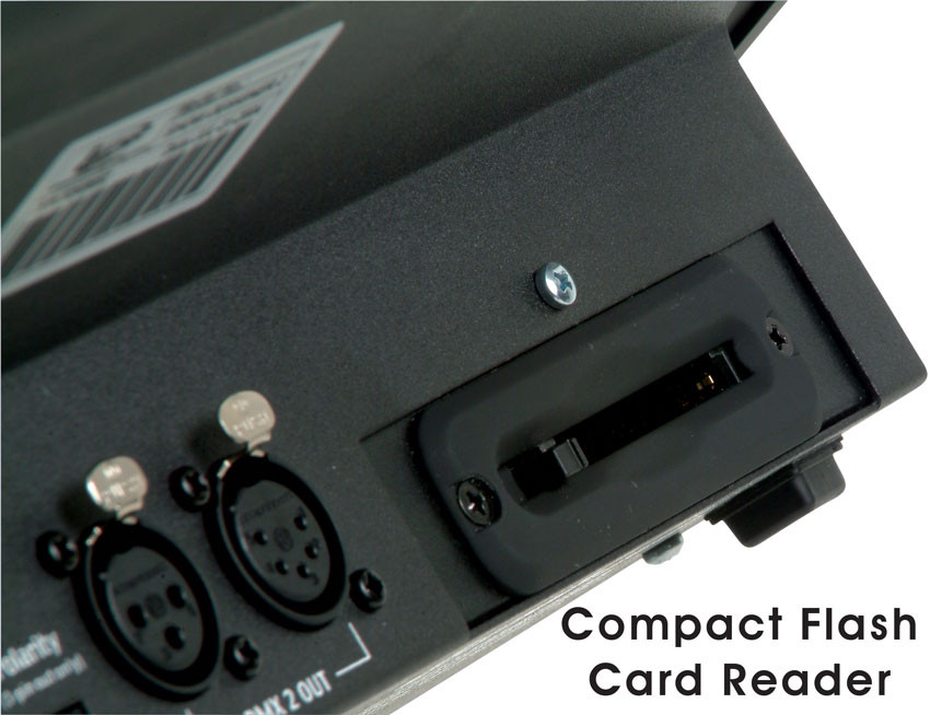 Features include an effects engine with 48 built-in chases, (48) multi-function quick access buttons, (8) faders x 4 banks providing control of up to 32 DMX channels per fixture and scene masters, (4) rotary wheels for data entry, a joy stick for pan and tilt control which can also be controlled using a standard PC trackball/keyboard (not included), an 80-character backlit LCD display for easy programming, 3/5pin XLR connectors for DMX-512 output, polarity switches (3pin only) to accommodate different types of cable requirements, MIDI In/Out, RCA audio input, RS232 and PS/2 ports for trackball and pc connections, an internal read/write compact flash card drive which supports FAT16 formatted (2GB max) cards to load fixture profiles, software updates, and backup memory, a USB work light port (light not included) and a removable outer case providing the ability for 6 space 19-inch rack mounting.