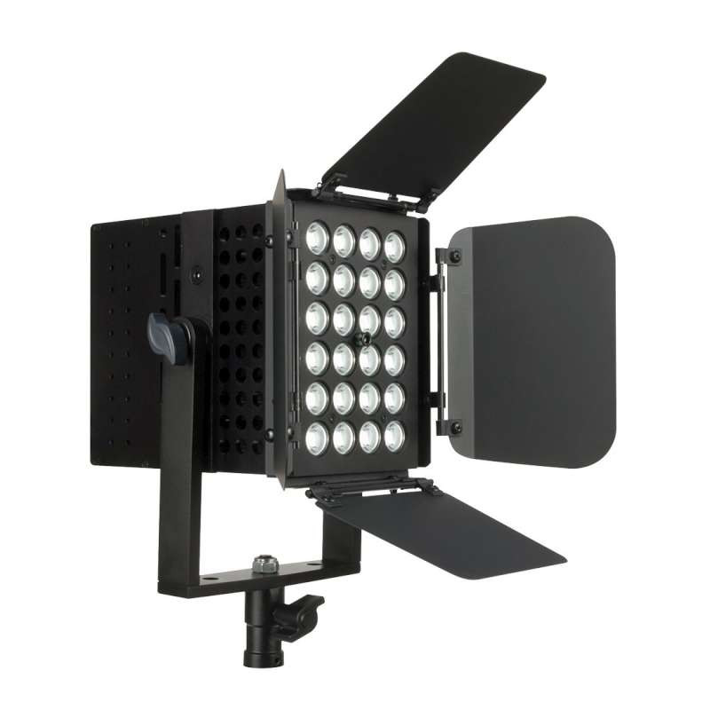 The improved TVL3000-II CW' features 24 cool white LEDs, variable beam angle, adjustable barn doors, flicker free operation for broadcast TV and FILM, 5 pin DMX in/out and optional battery pack for mobile applications. (4) button LED display control panel and 72W max power consumption.