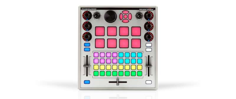 At the heart of Tweaker lies a grid of 32 rubber pads backlit by RGB LEDs, and 8 velocity sensitive groove pads. There is a channel strip on each side of the grid, and a crossfader centered underneath. Each channel strip is comprised of a fader, three RGB buttons, an analog knob, and three push encoders with red LED rings.