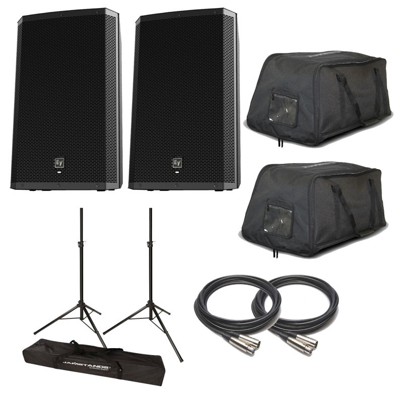 This Electro-Voice bundle includes (2) EV ZLX15P 15" Powered Speakers, (2) Odyssey BRLSPKMD 15" Protective Speaker Bags, (2) Ultimate Support Jamstands Speaker Stands, (1) Dual Speaker Stand protective carrying bag and (2) 20' XLR-XLR powered speaker cables.