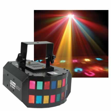 The E-144 is a small light, but is still a powerful effect for both clubs and mobile DJs. This unit features 2 x 120v 300w Lamps (EL-64514) that respond sound actively via its internal microphone.The effect creates a dramatic cluster of 32 multi-dichroic colored beams crisscrossing throughout the room.