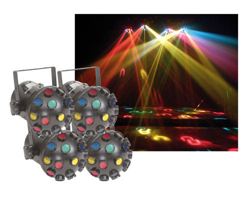 The E-134 Starblast System package is a lightweight 4 unit In-Sync-System which includes no moving parts! This means less problems and headaches for the on the go Mobile DJ.
