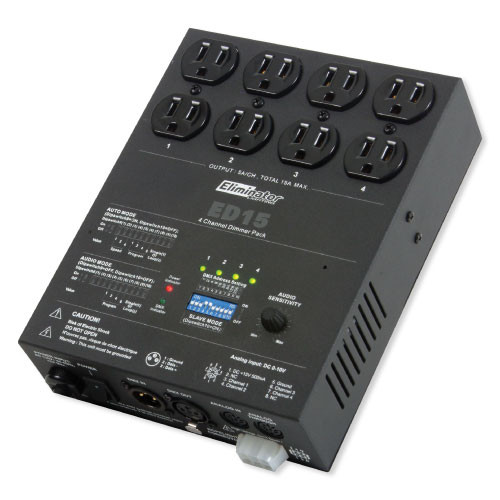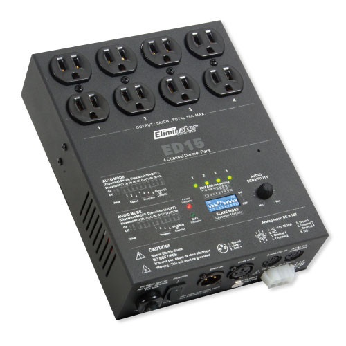 Take control of your light show with Eliminator's ED-15. Its unique 4-channel dimmer pack is designed to control your light fixtures movement. This 15-amp controller features 16 automatic and sound activated built-in programs. The ED-15 also features 600 watts per channel and comes with analog in and out points.