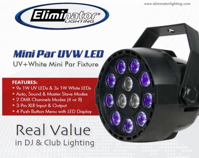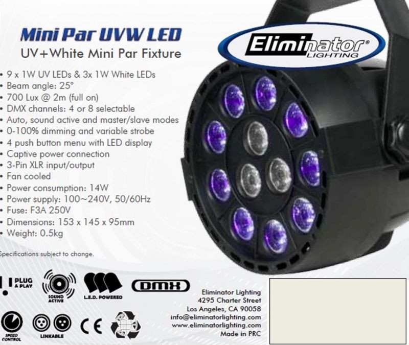 This light can be used in multiple modes... Sound-activated, Auto, DMX or Master-slave. Classic UV light effects, lightweight, portable unit, totally plug & play. UV LED Black light fixture creates a special lighting effects that make fluorescent body paints and ink, balloons, candles, cosmetics, bubbles, sticks and wall stickers glow in the dark; great for bands, clubs, dance, performance stage, theatrical productions, DJ events and mobile light shows. This light allow offers strobe effect. This fixture offers 9 1 Watt UV LEDs and 3 1 Watt White LEDs.