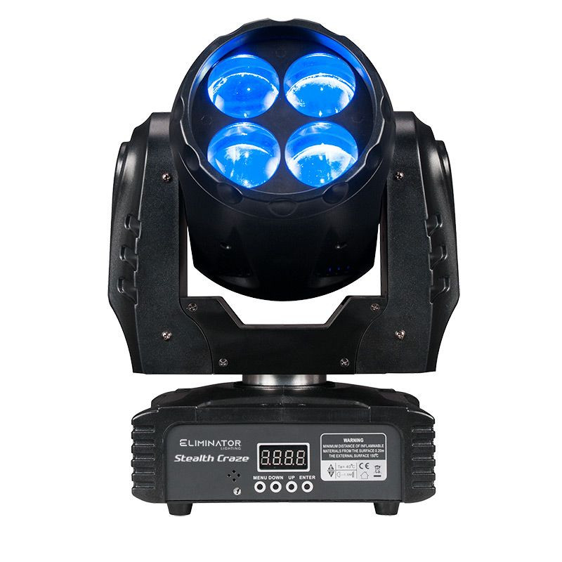 Brighten up your event with the Stealth Craze Moving Head. Take it anywhere, it's small and weighs only 10 pounds so it won't be a hassle whether you're playing locally or taking it from show to show on the road. Your crowd will be amazed when you hook this lighting effect up sound active to your music system and let it do the work or in DMX-512, or Show Mode; with its 8 built-in lighting shows you'll always have entertainment ready on the go. This great Eliminator Lighting product has all the essential features to make your show light up the night. To improve the experience, use an Eliminator fog machine to get the most of your LED lighting experience. From weddings to clubs to stage shows, the Stealth Craze by Eliminator Lighting is a great addition to an essential component of any great event if you want to offer your clients a night to remember.