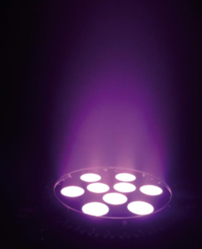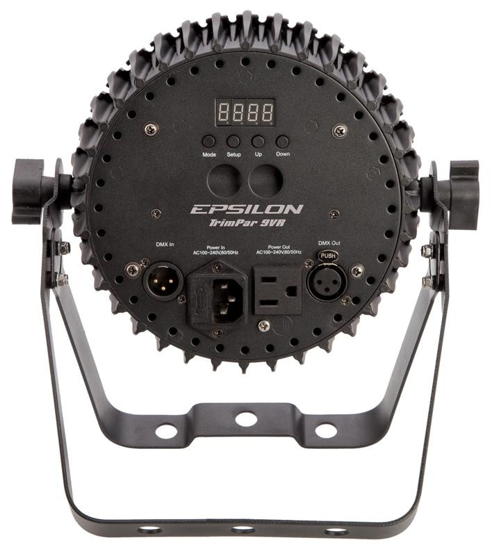 The EPSILON Trim-Par 9VR is a powerful 5-in-1 (RGBWA) low profile LED wash light with 9* 10 watt LEDs including an IRC remote for easy set up and operation without the need of programming. Our TrimPar series deliver bold and brilliant color mixing with smooth and even outputs without shadows for professional production and mobile entertainment. Save time programming by power linking multiple units together and easily triggering the built-in automatic and sound activated shows via the IRC remote control.