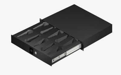 2U rack drawer that accommodates the storage of 10 hardwired microphones
