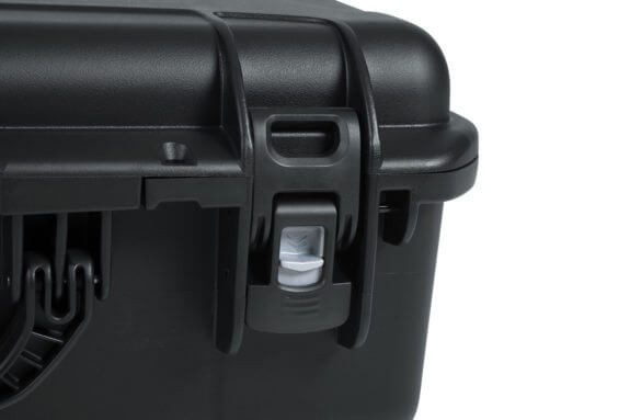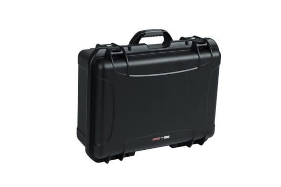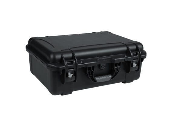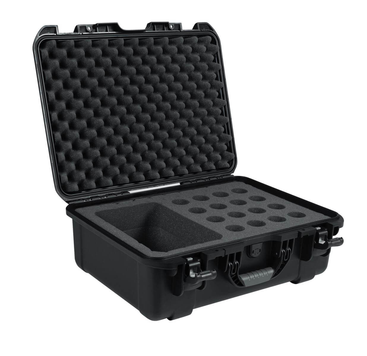 Black waterproof injection molded case with foam insert to accommodate 16 handheld mics and accessories.