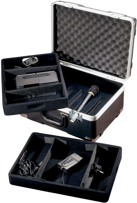 * 2 lift out trays that each have two adjustable dividers are perfect for separating the lavalieres, belt packs, batteries, cables and other various wireless accessories.