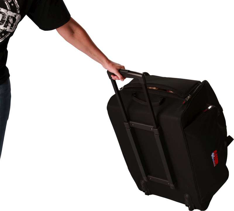 The GPA-700 is designed to fit the popular molded speaker cabinets such as the JBL Eon Series, Mackie, DAS, American DJ and Peavey. The case has a large side pocket designed to fit 100 ft. speaker cables, two accessory pockets, heavy-duty six wheel assembly and strong pull out handle. The bottom of the case has skid bars for going up stairs and over obstacles. Handles are strategically located to allow easy lifting. 10mm side foam and a sculptured industrial foam interior over a floor of Polyethylene, makes your speakers ride from van to venue easily and safely! Rated up to 100 pounds.