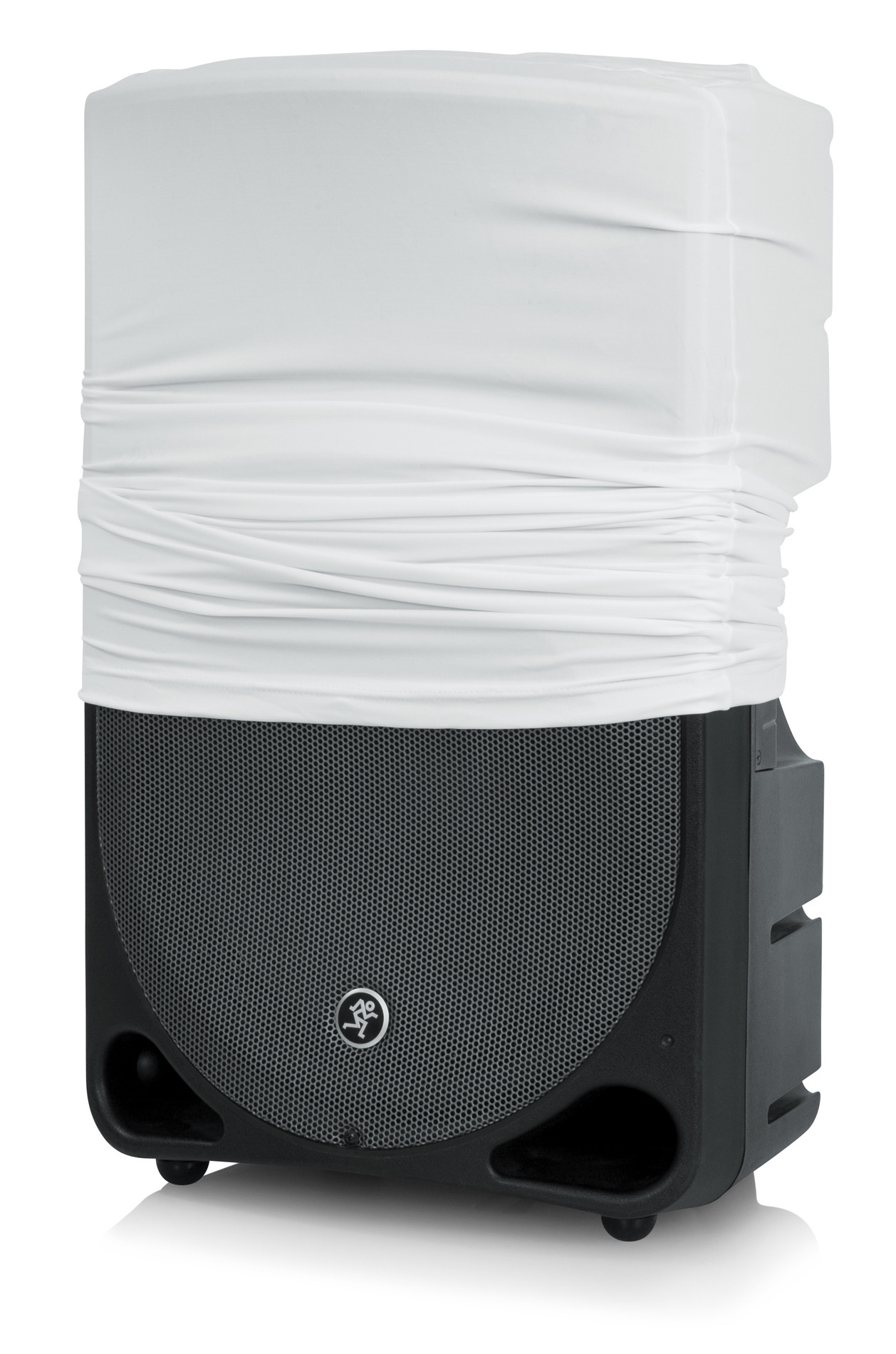Stretchy dust cover to fit most 15" portable speaker cabinets. White. Pair of two.