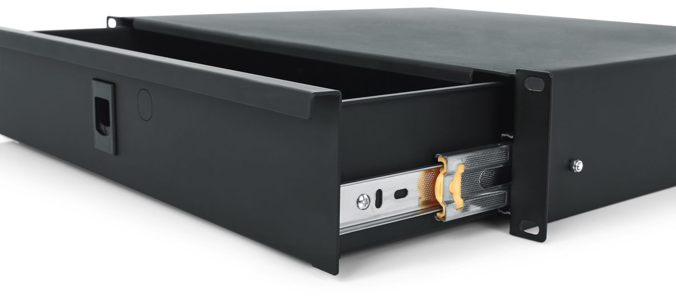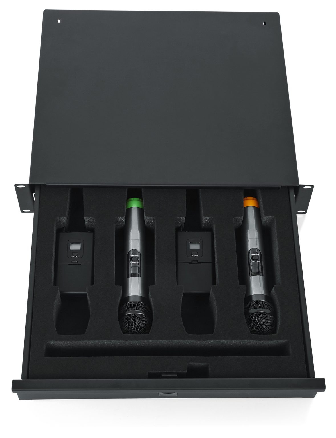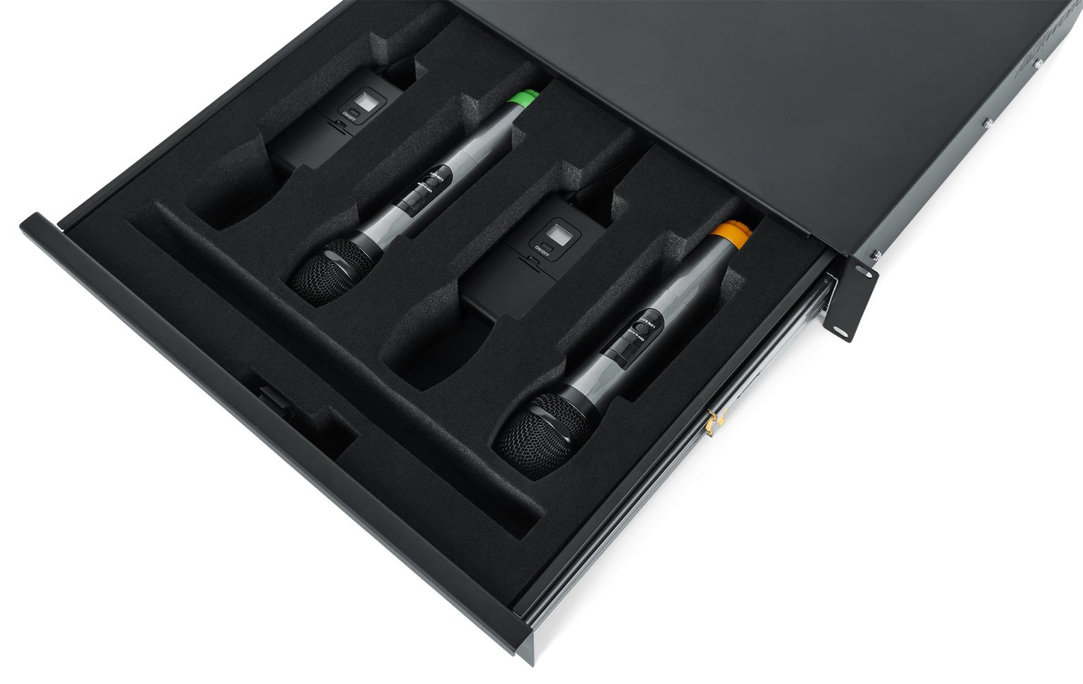 Gator Rackworks Rack Drawer; 14.2" Deep; Lockable; Interior has Insert for 4 Wireless Microphones or Body Packs & Accessories; 2U
