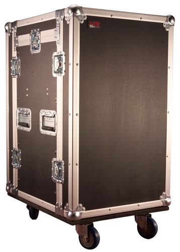 The Gator GTOUR10x14PU is an ATA pop-up console rack road case; 10U top; 14U bottom; with casters