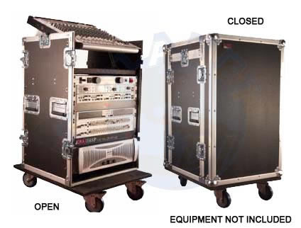 FEATURES INCLUDE:• Mobile audio 19" console rack with pop-up top loaded rack• 9mm plywood construction with PVC exterior• Recessed latches & handles• Heavy-duty zinc plated hardware• Reinforced stackable ball corners• Top rack uses a pop-up ratchet system for transporting flat then elevating to various angles• 4" heavy-duty industrial casters, 2 which are locking• 2 Spring loaded recessed handles on each side for easy lifting to stage or truck• Heavy-duty threaded rack rail