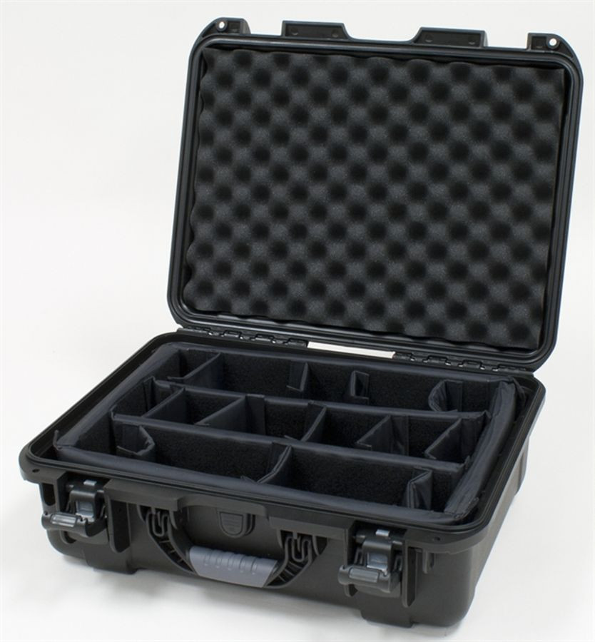 Black waterproof injection molded case with interior dimensions of 18" x 13" x 6.9". INTERNAL DIVIDER SYSTEM
