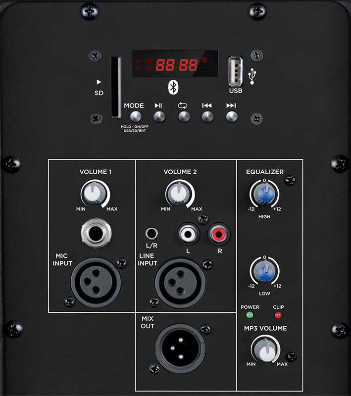 • Integrated MP3 player with connections for USB, SD, and Bluetooth