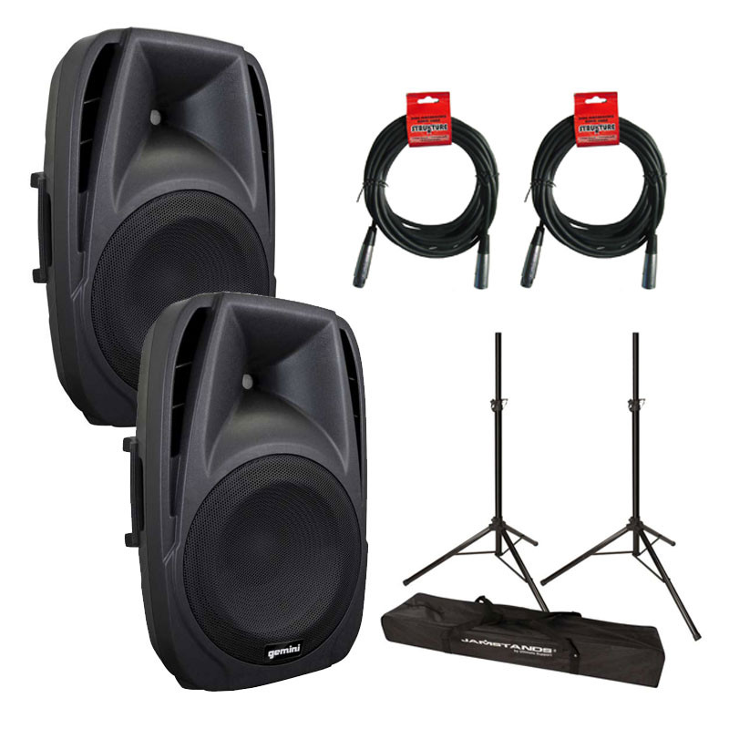 This Gemini bundle includes (2) Gemini ES12P Powered Loudspeakers, (2) Speaker Stands, (1) dual speaker stand protective carrying bag and (2) 20ft XLR-XLR cables.