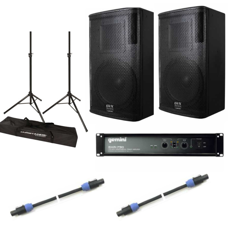 This Gemini bundle includes (2) Gemini GVX12 Speakers, (1) Gemini XGA-750 power amplifier, (2) Ultimate Support Jamstands speaker stands, (1) Speaker Stand protective carrying bag and (2) 25' Speakon to Speakon speaker cables.